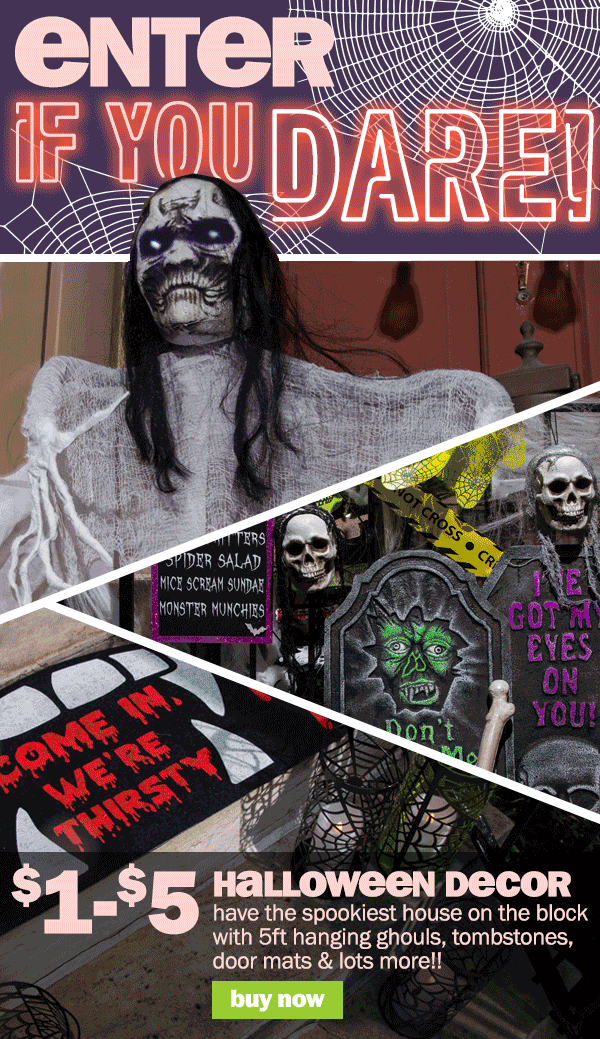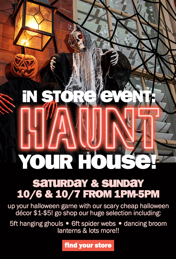 shop all new $1-$5 halloween décor like $5 5ft hanging ghouls, $4 door mats & more plus, this wknd only: haunt your house in-store event! can't see this email? click here |