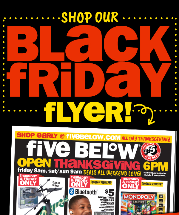 get it all first at fivebelow.com! in store action starts 6pm thanksgiving!! can't see this email? click here |