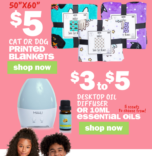 shop $5 printed blankets, $3-$5 desktop oil diffuser and oils, $5 lounge pants & lots more!! can't see this email? click here | |||||||||||||||