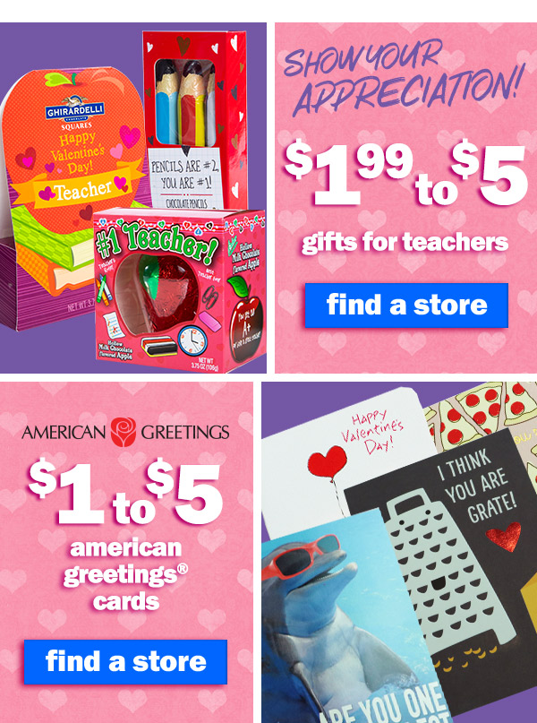 shop $1-$5 valentine's day faves like teacher gifts, cards, candy card kits & more!! can't see this email? click here | |||||||||||||||