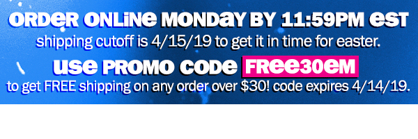 GET FREE SHIPPING on any order over $30!! order online by mon 4/15 to get it in time using standard shipping!! can't see this email? click here | |||||||||||||||